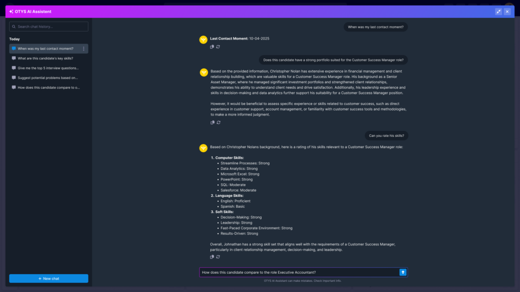 Dankzij deze chatfunctionaliteit ga je razendsnel van overzicht naar detail. Of je nu in een procedure, een vacature of een relatiekaart zit: met één vraag krijg je direct antwoord, zonder omslachtige stappen. Zo werk je sneller, slimmer én met meer focus op wat écht telt.